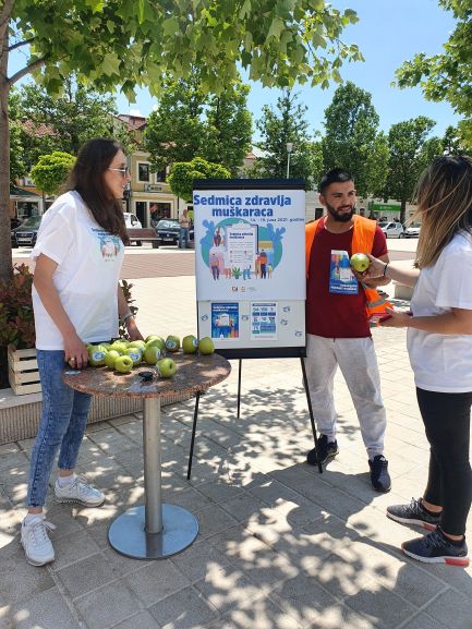 [:en]In order to raise men’s awareness for early detection and treatment of diseases, the Center for Roma Initiatives in cooperation with- Propaganda bar, Caffe Gradska, Lounge & bar Piazza and on Freedom Square implemented an activity within the campaign “Be a Man, Take Care of your Health”. Apples which are symbol of health as well as informative propaganda material were distributed to 117 men.