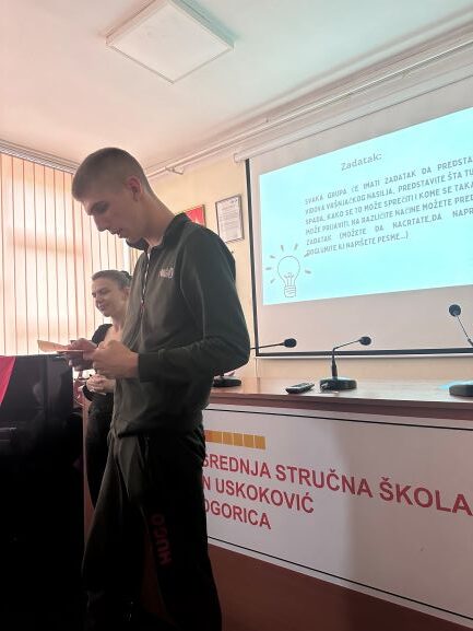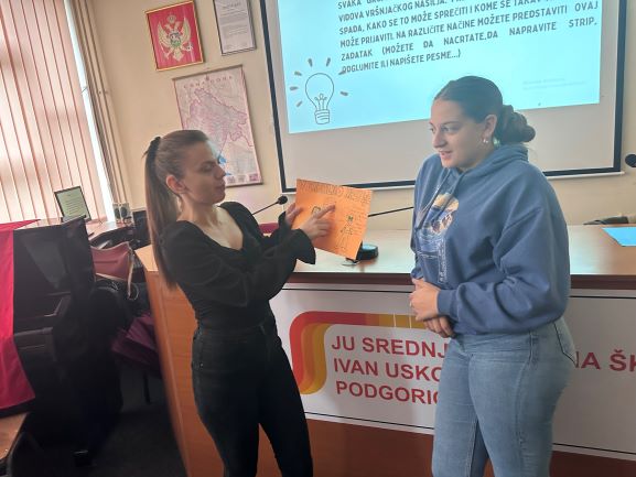[:bs]U dvije srednje škole u Podgorici (Srednja Stručna škola ,,Ivan Uskoković’’ i Srednja građevinsko-geodetska škola ,,INŽ. Marko Radović‘’) 24.11.2023.godine realizovane su dvije radionice o rodno zasnovanom nasilju pod nazivom ,,Ko se bije, taj se NE voli‘’. Učenici/ ce su imali/e priliku da čuju nešto više o Međunarodnom danu borbe protiv nasilja nad ženama, vrstama nasilja, posledicama, kao i kome prijaviti nasilje ukoliko do njega dođe. Podijeljeni u grupe, učenici/ce su na kreativan način obradili različite vrste nasilja (kroz crtanje, pisanje pjesama, priča, igranje uloga) i to predstavili ostatku grupe, a kasnije i prodiskutovali o svakom obliku nasilja.